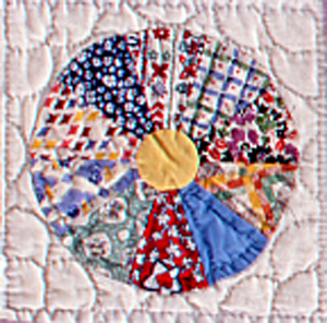 1930年 オハイオ州・236cm×210cm マイセンで代表されるようなドレスデンの陶器をイメージしたキルトパターンです。草木染めの紫を台地にし、白であしらった生地の上にピーシングが施された繊細な模様になっています。紫の台地には細かいロープ上のキルティングが施され、90ブロックのプレートには万華鏡のようにくるくる回るようにイメージされています。
